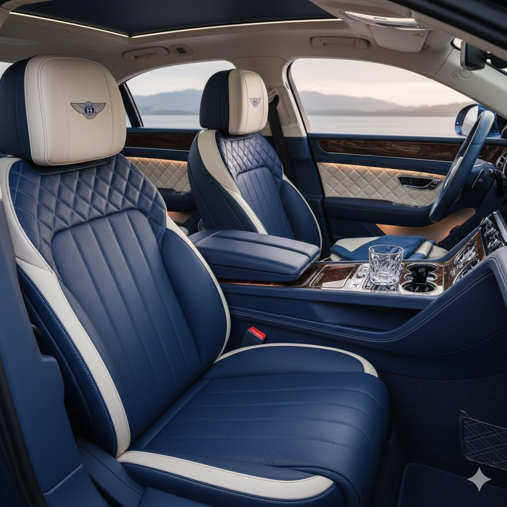 Masuk ke kabin Bentley Flying Spur Azure seperti memasuki lounge mewah. Material kulit premium, trim kayu alami, dan detail jahitan tangan menciptakan suasana yang sangat eksklusif.